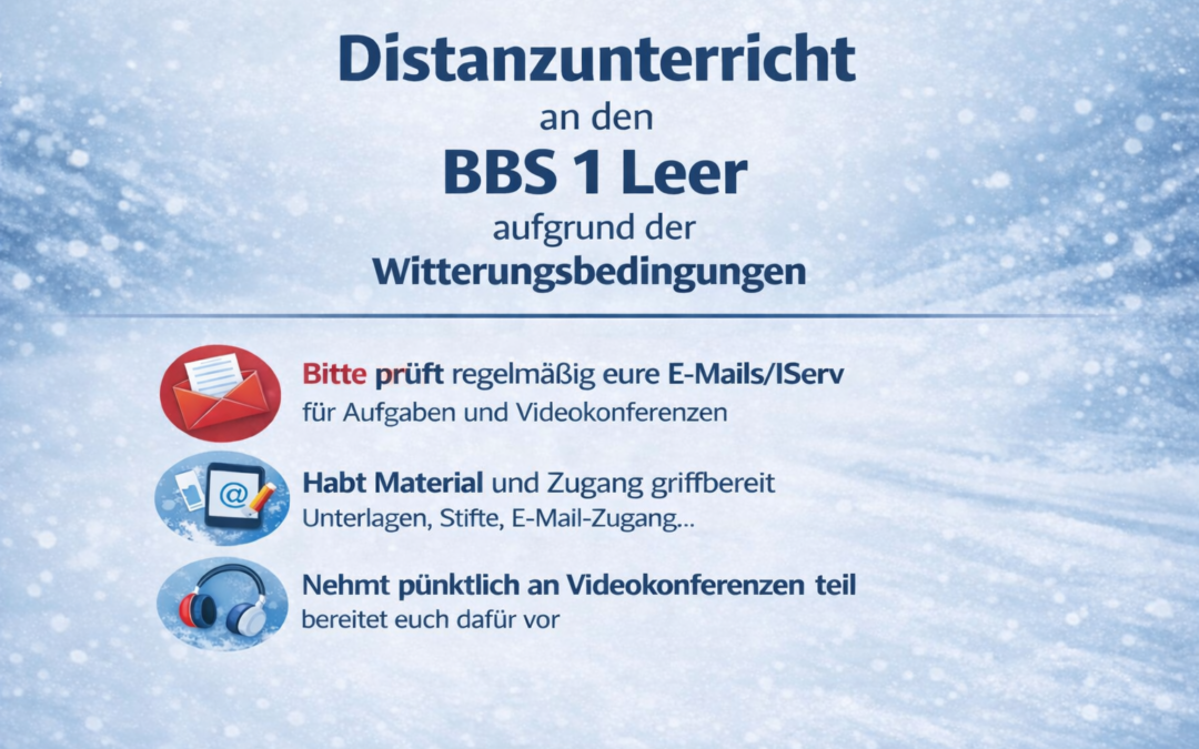 Aufgrund der angekündigten Wetterlage und der erwartungsgemäß erschwerten Straßen- und Wegesituation fällt am Montag, den 12. Januar 2026, der Präsenzunterricht für alle Schülerinnen und Schüler an allen allgemein- und berufsbildenden Schulen im Landkreis aus. An den BBS 1 Leer wird Distanzunterricht erteilt.
