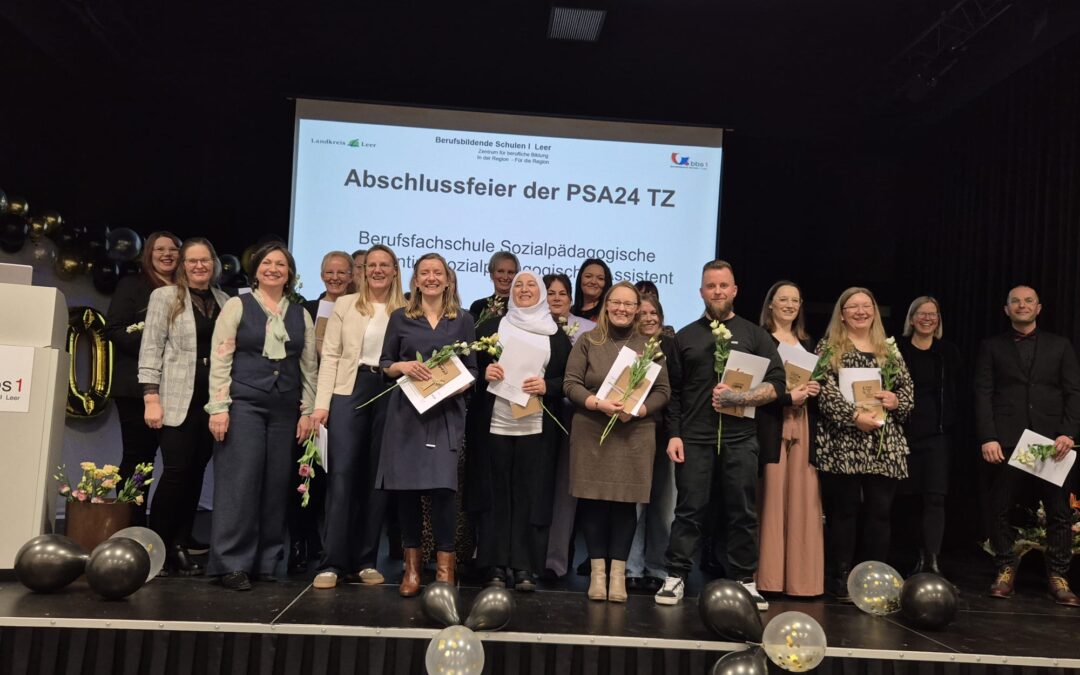 Mit dem Abschluss der PSA24 Teilzeit gewinnt der Landkreis Leer engagierte und qualifizierte Assistenzkräfte für den Elementarbereich. Alle Absolventinnen und Absolventen verfügen bereits über Arbeitsverträge oder stehen unmittelbar vor dem Berufseinstieg. Einige von ihnen setzen ihren Bildungsweg fort und nehmen die Erzieherausbildung in Teilzeitform an den BBS Wittmund auf.